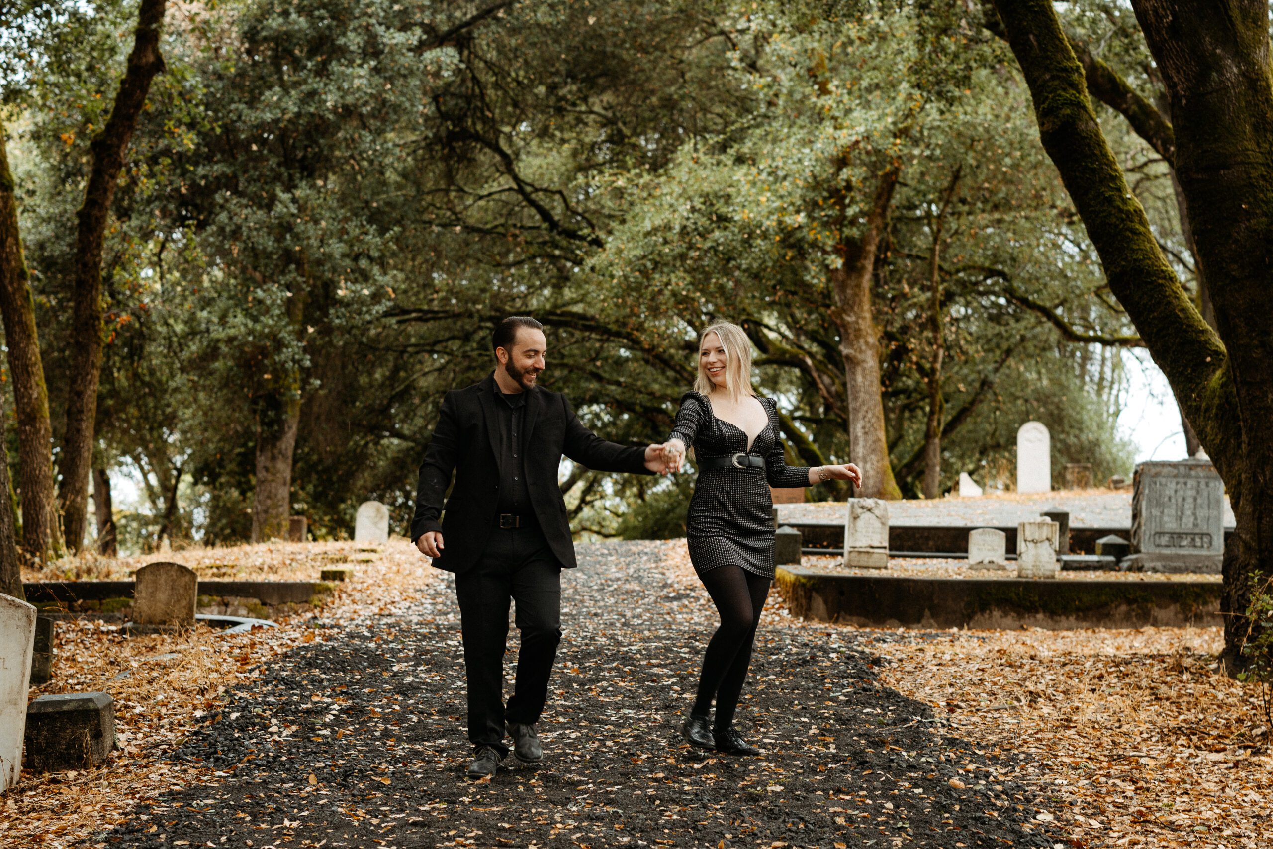 Dressed in black, Nikki and Casey looked like they belonged there in the best way possible. The misty air, quiet stillness, and towering moss-covered headstones created an atmosphere that felt straight out of a romantic film.